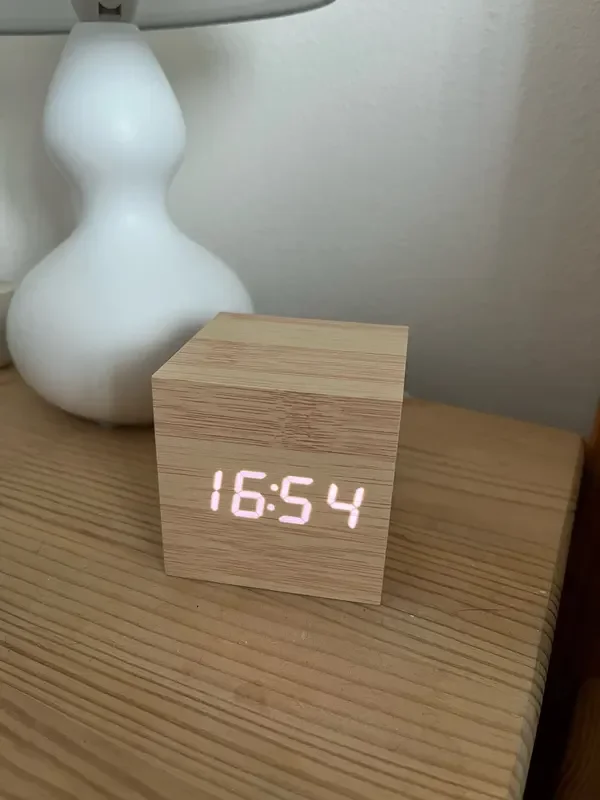 The cube form and soft LED light offer subtle beauty. The voice or sound control and brightness adjustments reflect thoughtful simplicity. Set it to sleep until it senses a clap, or let its glow keep time quietly on your desk or nightstand.